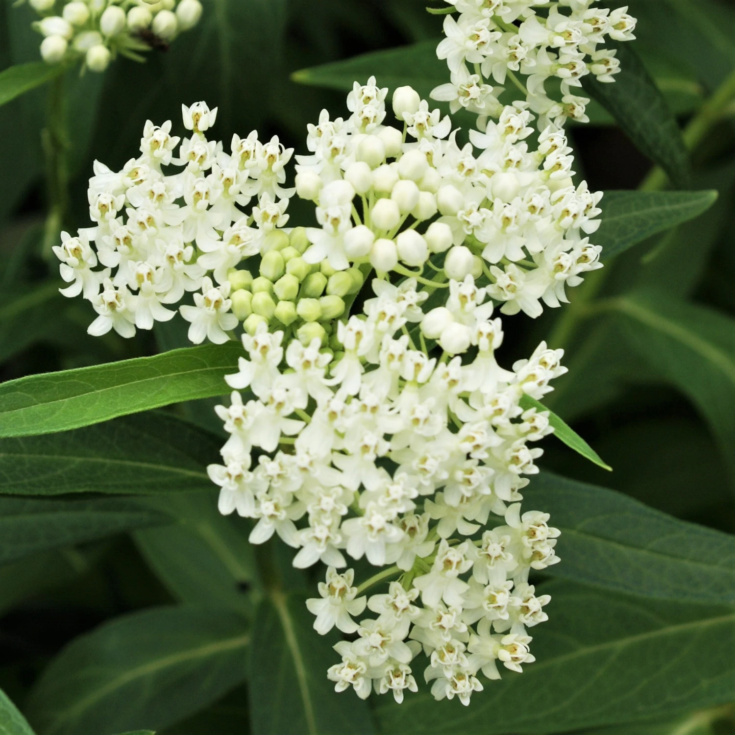 Clusters of fragrant, cloudlike white flowers cover the Ice Ballet Asclepias Incarnata, more commonly known as white butterfly flower or swamp milkweed. The tall stalks wave in the breeze, enticing butterflies and hummingbirds alike from late spring to midsummer.