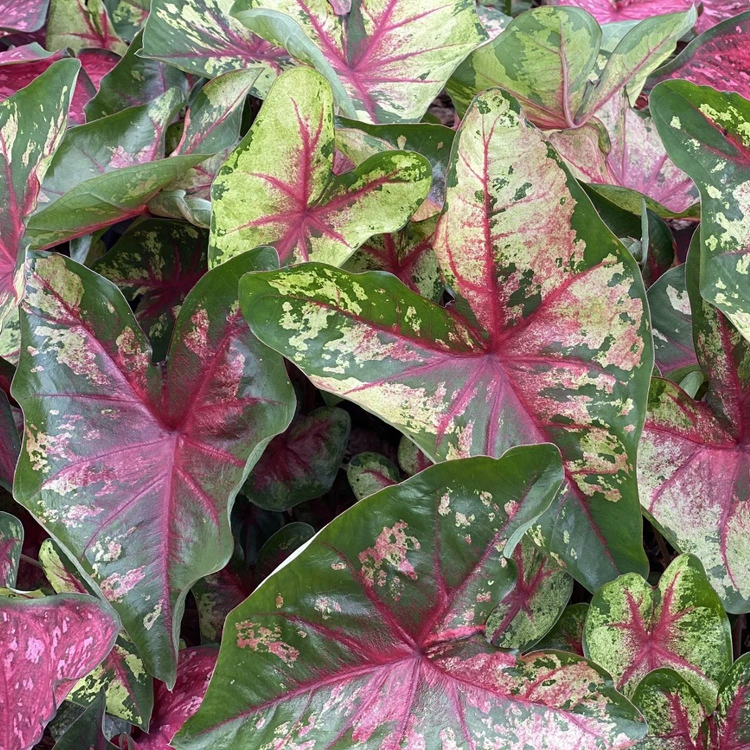 It has been said it isn’t flattery if its true. So pile on the compliments about Caladium Flatter me – the intriguing beauty of the irregularly mottled leaves with light and dark green contrasting with the vivid splashes of crimson red veining. The colorfast quality of the handsome leaves even when grown in full sun! Feel free to wax eloquent in praise of this lovely new caladium – safe in the knowledge that it won’t be empty flattery!