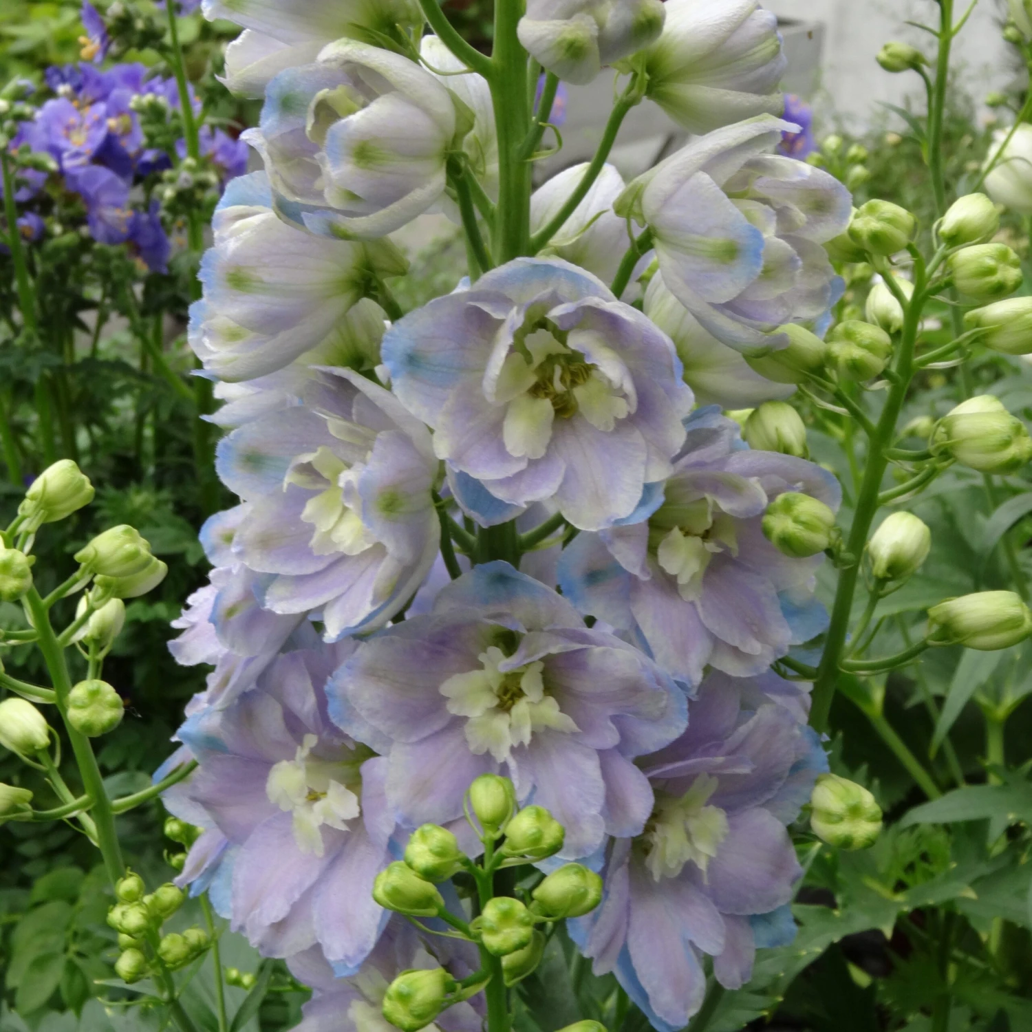 Delphiniums take center stage in the early summer border, forming a compact mound of intricately cut green leaves that serve as a backdrop for tall spikes of luxurious, satiny flowers. Guardian Lavender stands out for its early bloom, producing towering spikes adorned with double light lavender-mauve blossoms complemented by hints of blue – a breathtaking sight in a sun-drenched garden.