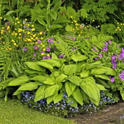 Extreme sun tolerance isn’t the only exceptional attribute of Hosta Stained Glass; Large, delightfully fragrant, pale lavender blooms appear in the late Summer on 30′ scapes. Give this beauty a home in a moist, shady spot to add to your dramatic foliage display!