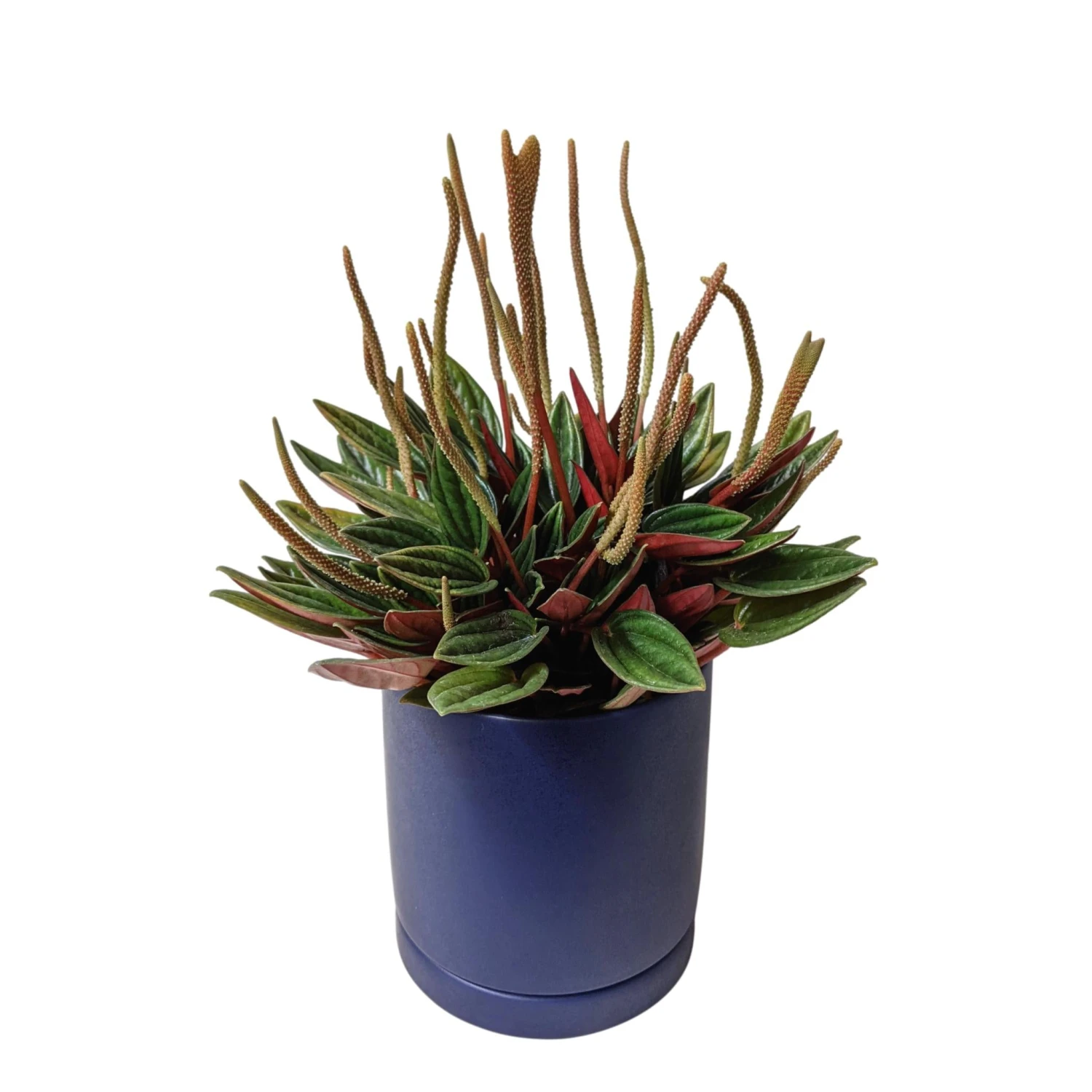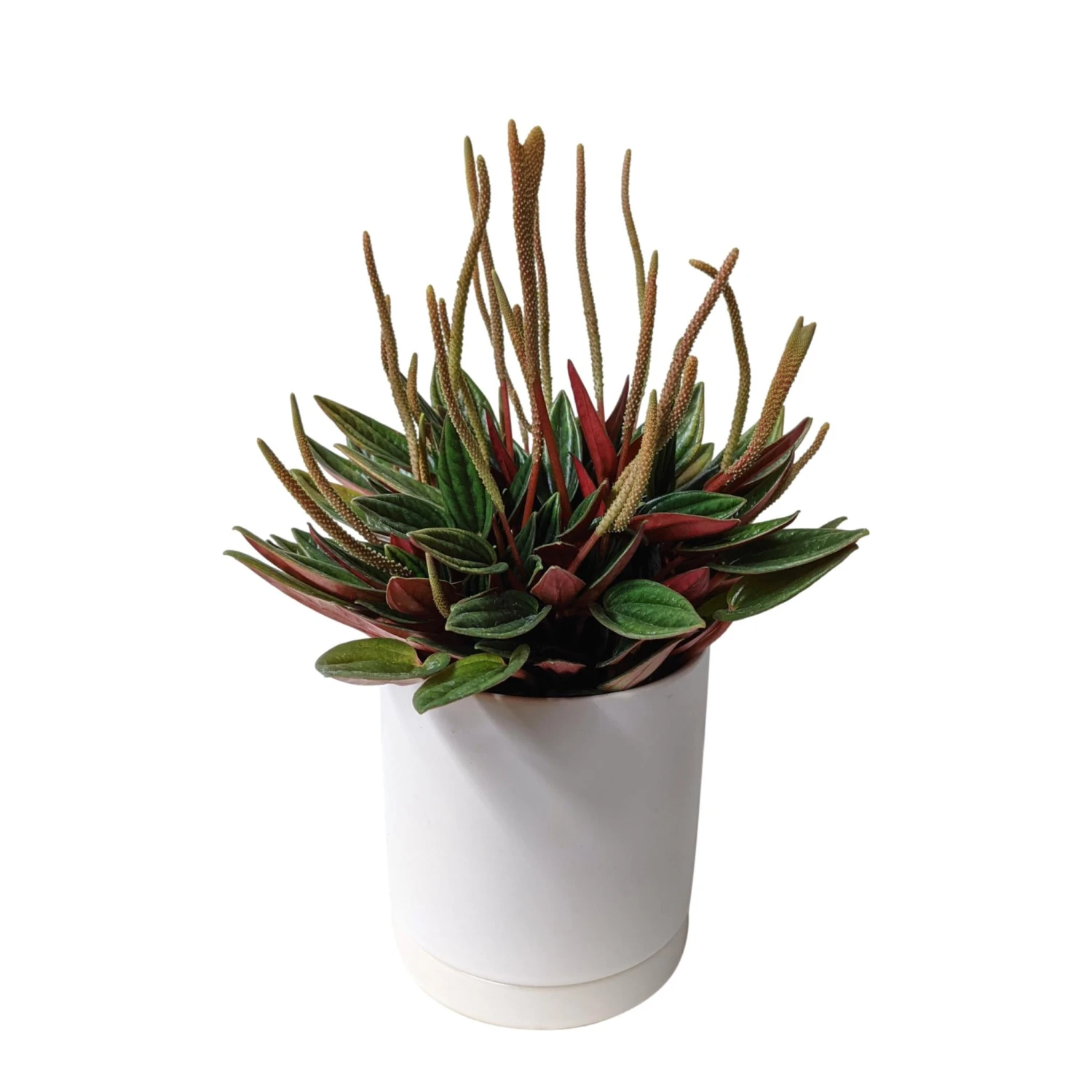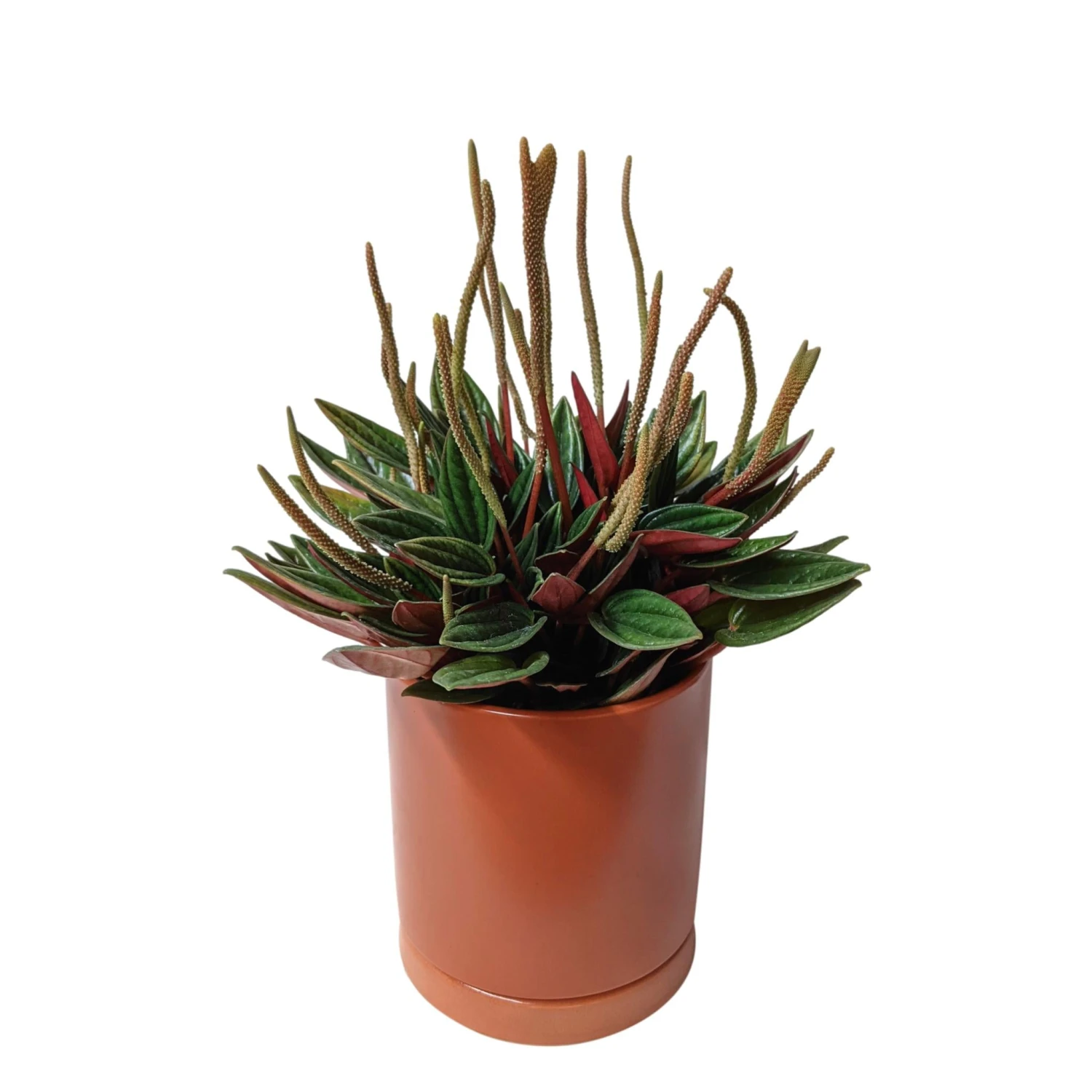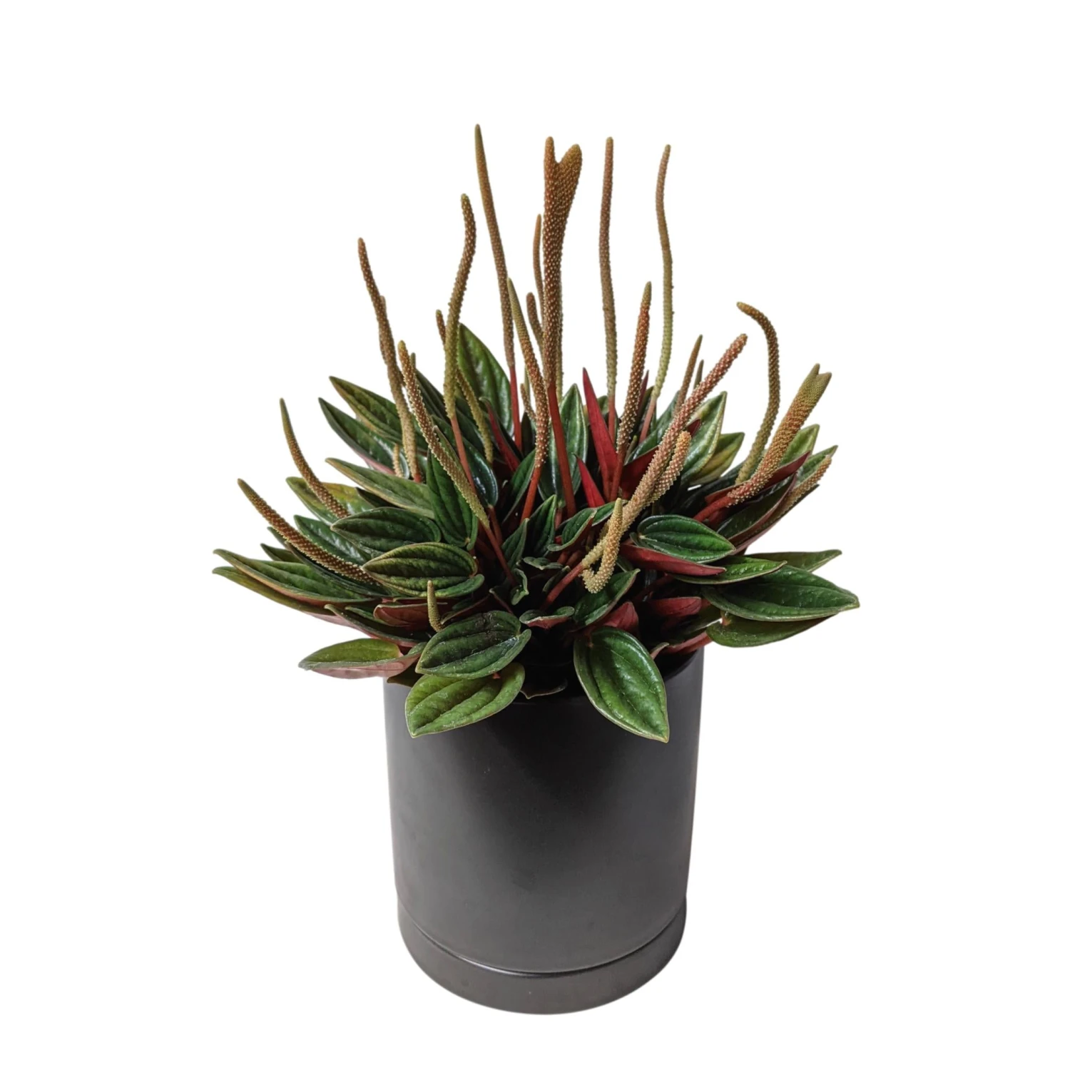 As if the textural leaves on peperomias weren’t quite enough, Rosso throws in a little more color to liven things up. The leaves are more pointed than either Ripple Green or Ripple Emerald, and, while the top side of the leaf is green, the underside is a brilliant and luscious shade of red. Arriving in an attractive ceramic pot of your choice, Rosso is ready to charm in office and home settings alike.