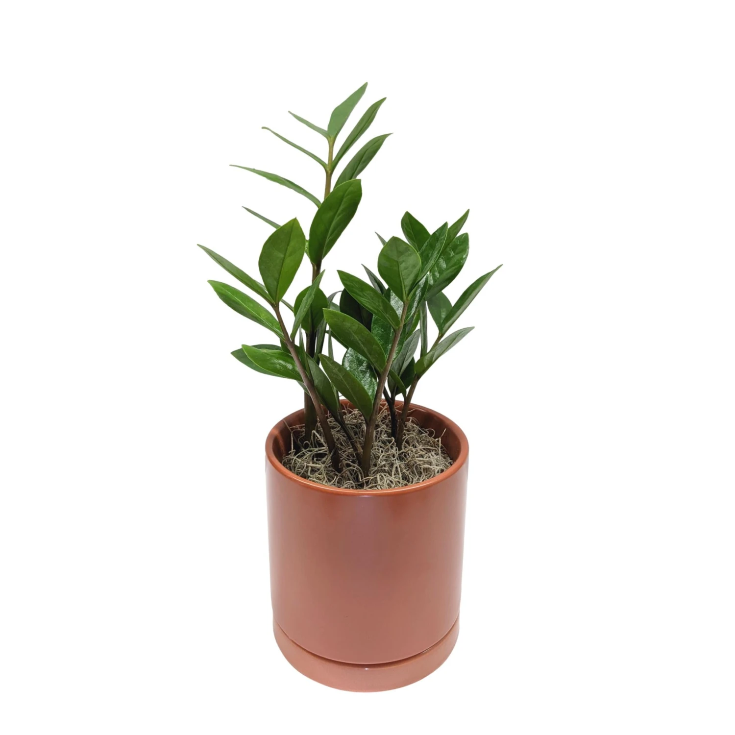 Upright growth, shiny green leaves, a unique appearance, and minimal care — that’s what makes ZZ plant earn gold stars as a low maintenance houseplant for people on the go. It comes in your choice of stoneware pot, and will happily brighten up your table or desk until it grows to floor-size. This is a great plant for houseplants newbies.